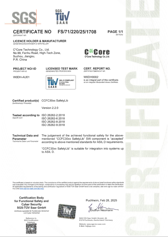國芯科技一直高度重視“芯”安全,秉持長期主義理念,以自主創(chuàng)新發(fā)展為引領(lǐng),持續(xù)構(gòu)建“芯”安全體系。此前,公司已通過ISO 26262 ASIL-D功能安全體系和流程認(rèn)證;2024年8月,國芯科技安全氣囊點火驅(qū)動CCL1600B系列芯片通過TüV北德” ISO 26262 ASIL-D功能安全產(chǎn)品認(rèn)證,這是國內(nèi)首顆獲得ASIL-D 功能安全產(chǎn)品認(rèn)證的安全氣囊點火驅(qū)動芯片;2024年11月,國芯科技高端動力、底盤、域融合MCU產(chǎn)品CCFC3007、CCFC3008系列芯片通過德國萊茵TüV ISO 26262 ASIL-D功能安全產(chǎn)品認(rèn)證。此次基于CCFC30XX系列MCU芯片開發(fā)的SafetyLib軟件成功通過ISO 26262 ASIL-D功能安全產(chǎn)品認(rèn)證,意味著CCFC30XX系列無論硬件、軟件均已達(dá)到最嚴(yán)格的ASIL-D要求。上述系列認(rèn)證的取得不僅標(biāo)志著使用CCFC30XX系列MCU產(chǎn)品已能夠滿足不同應(yīng)用領(lǐng)域極為嚴(yán)格的安全標(biāo)準(zhǔn),更意味著國芯科技能夠為客戶提供完整、高可靠的系統(tǒng)級功能安全支持,有能力為客戶在汽車電子領(lǐng)域產(chǎn)品的安全可靠應(yīng)用提供堅實保障。